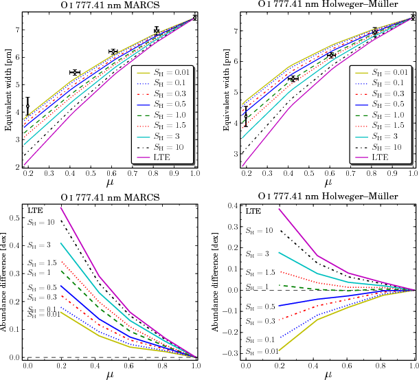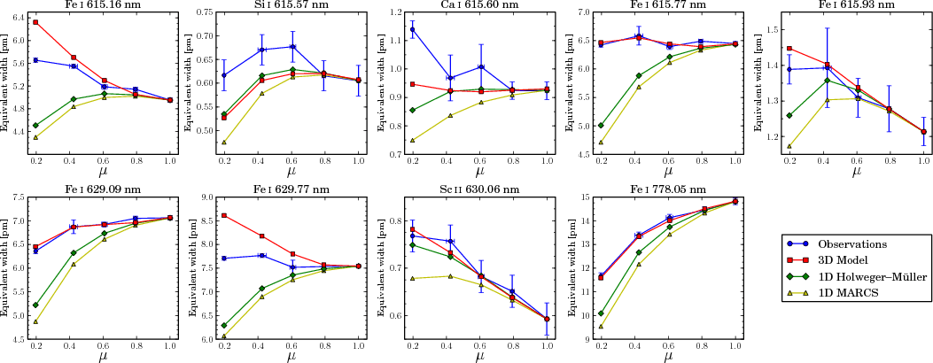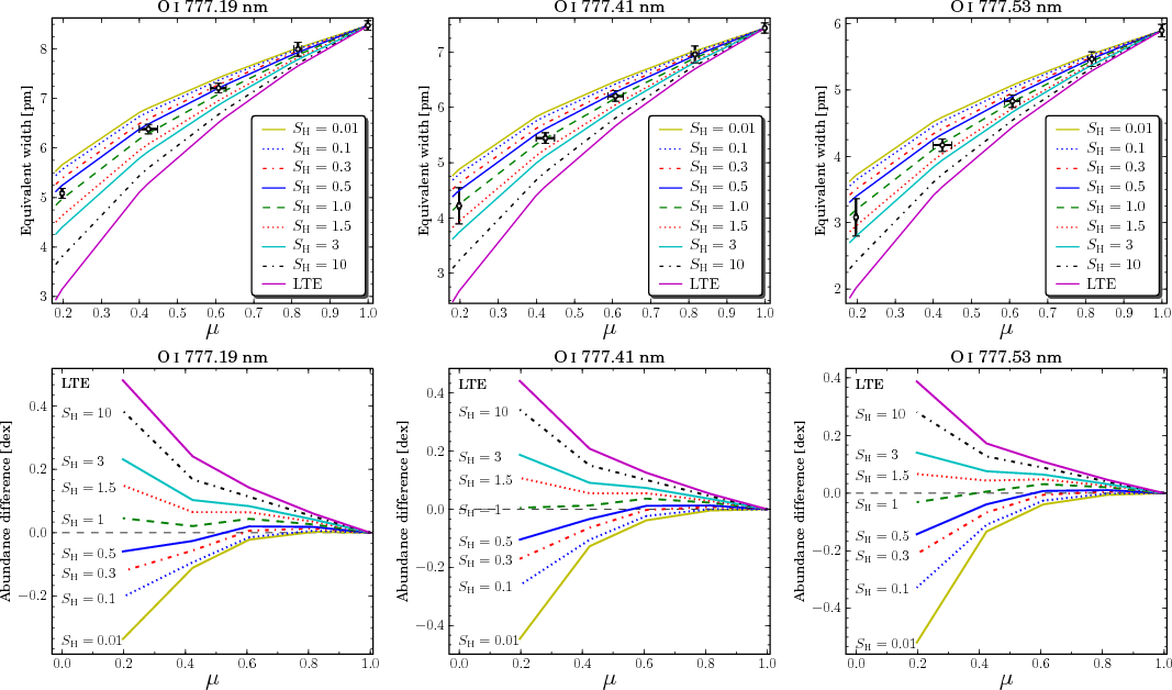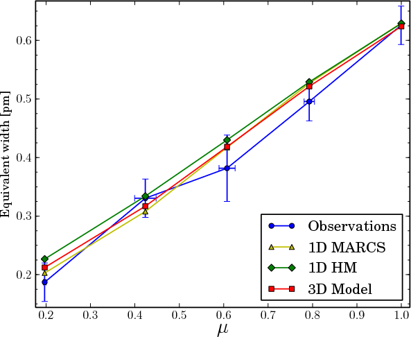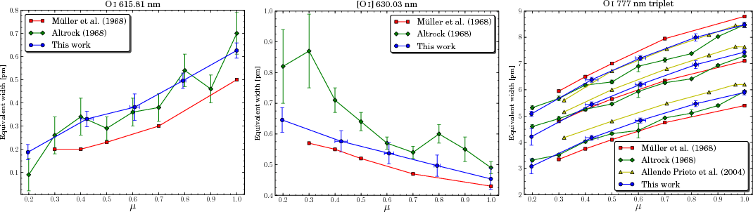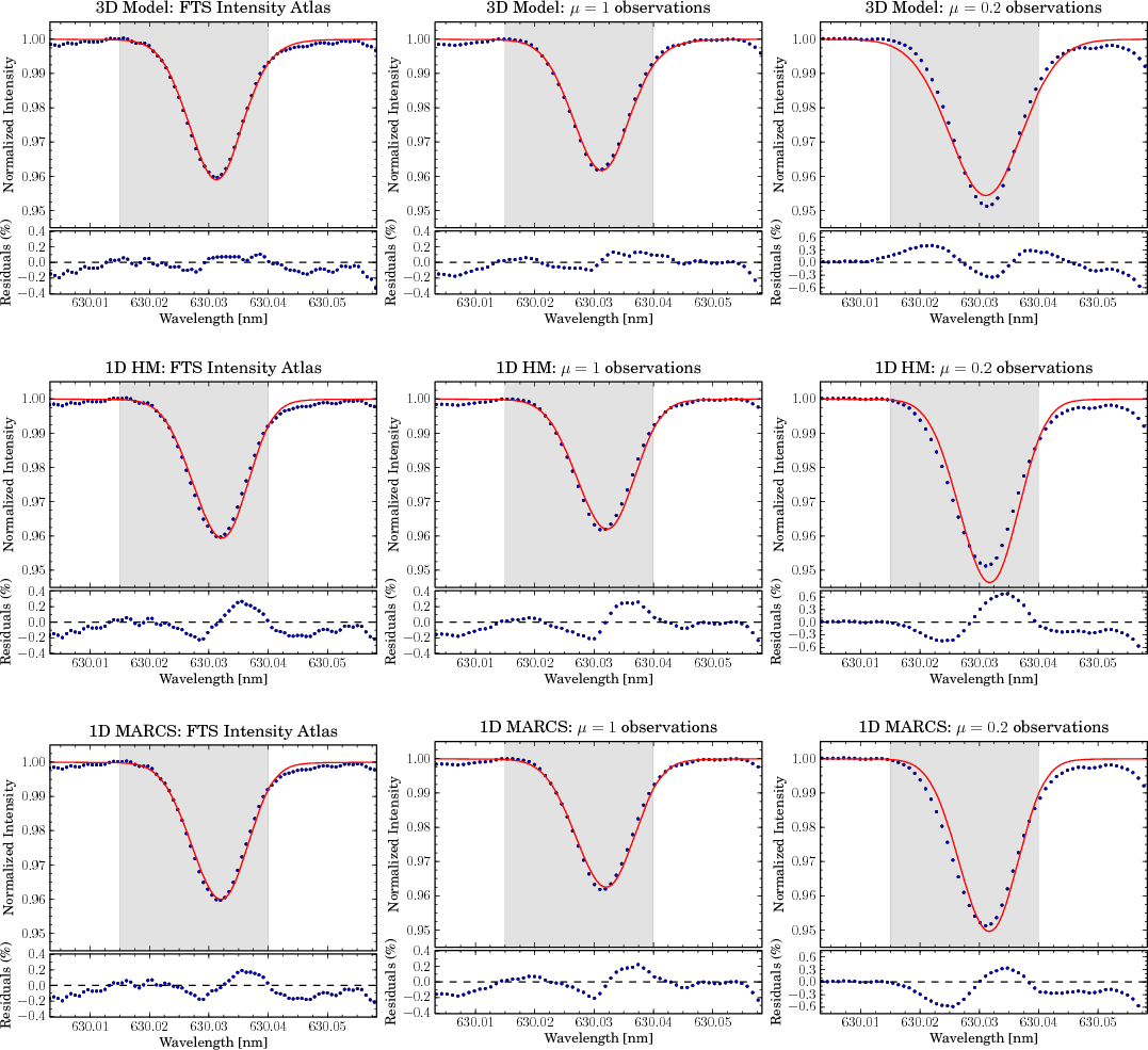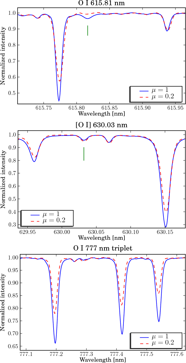 - The oxygen abundance was the only adjusted parameter in the disk-centre fit, and all other lines have the same abundance and parameters throughout the analysis.