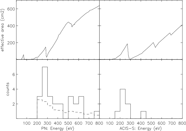 Figure 1: Upper panel: effective areas of XMM PN and Chandra ACIS-S at energies below 800 eV. Lower panel: detect cell counts (solid histogram) of 51 Peg in PN and ACIS-S over the respective backgrounds (dashed; ACIS-S has practically no background). |