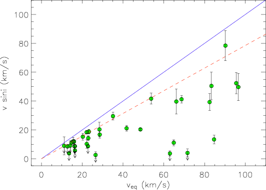 correlation between projected angular rotational velocity divided by