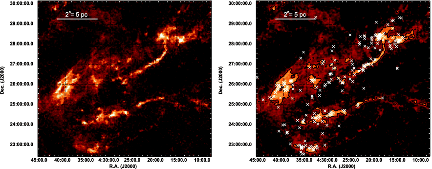 pre-main-sequence stars that clearly concentrate on the regions of high column density (Rebull et al. 2009).