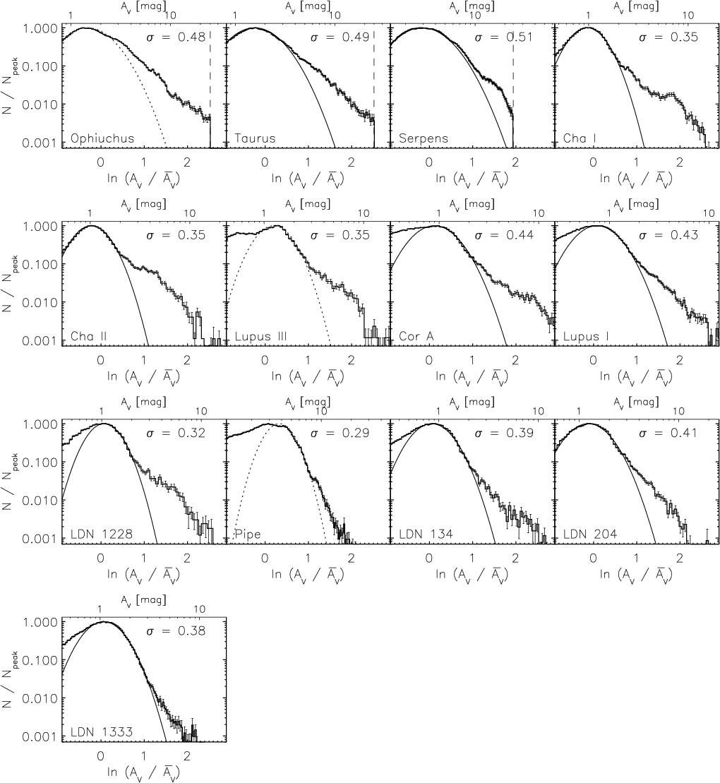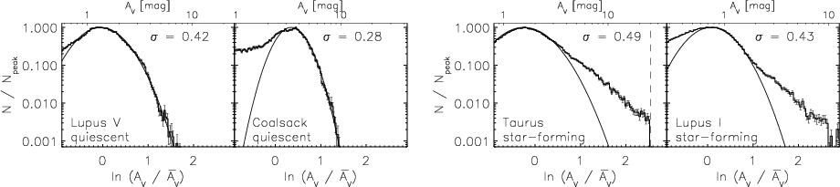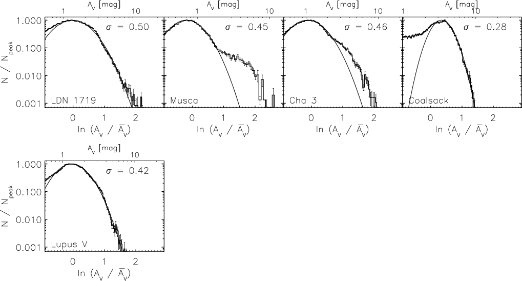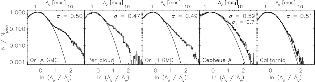 The log-normality of the probability distributions of density is reflected also in column densities computed from simulations (e.g. Vázquez-Semadeni & García 2001; Federrath et al. 2009; Ostriker et al. 2001). Unfortunately, measuring column densities in molecular clouds is a challenge in astrophysics by itself. The commonly used methods for deriving column densities, i.e. measurements of CO line emission, thermal dust emission, and dust extinction, suffer from various model-dependent effects, and often probe only narrow ranges of physical conditions (e.g. Vasyunina et al. 2009; Goodman et al. 2009).
