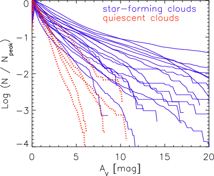 Intriguingly, our data appear to show a clear trend. All clouds with active star formation show strong excess of higher column densities (Figs. 2 and 4). In contrast, almost all quiescent clouds have PDFs that either are well described by log-normal functions over the entire column density range, or show relatively low excess of high column densities (Figs. 2 and 5). The trend is obvious for the lower-mass clouds in our sample, but an indication of it is seen also among the more massive clouds (Fig. 6): the active star-forming clouds of Orion have prominent wings compared to the California nebula, a massive cloud with significantly lower star-forming activity (Lada et al. 2009). In the context of turbulent molecular cloud evolution, these observations agree with a picture in which the structure of a molecular cloud in the early stage of its evolution is decisively shaped by turbulent motions. Hence, its column density PDF is close to log-normal, as is the case for the non-active clouds in our sample. As the cloud evolves, prominent local density enhancements can become self-gravitating, which also assembles a growing fraction of the gas to higher column density structures. This significantly alters the simple log-normal form of the column density PDF and is very concretely demonstrated by the cumulative forms of the PDFs (Fig. 3), showing how dramatically the fraction of material at high column density increases from non-active to active clouds. The cumulative PDFs shown in Fig. 3 generalise this trend, suggested earlier by studies of individual cloud complexes (Lada et al. 2009; Lombardi et al. 2008a,2006; Cambrésy 1999). In the low column density regions of molecular clouds turbulent motions prevail as the dominant structure-shaping mechanism, as indicated by the log-normal-like parts of the PDFs. This appears natural, since those are likely to be the regions where the role of self-gravity remains small.