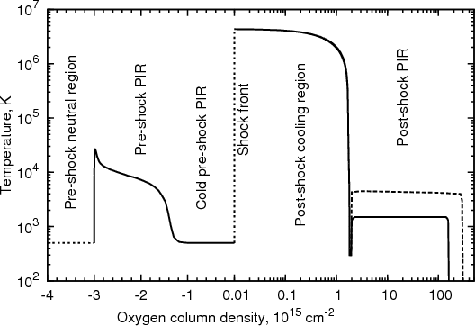 - We performed our own computations of the post-shock plasma recombination and discovered that our oxygen ion distribution over ionization stages is rather similar to that presented in the lower panel of Fig. 3 of the Sutherland & Dopita (1995), but only if the ion spectroscopic symbols in that figure are increased by unity. Therefore, we assume that Fig. 3 of Sutherland & Dopita (1995) has a misprint and the ion spectroscopic symbols should be read, e.g., ``O VII'' instead of ``O VI'', ``O VI'' instead of ``O V'', etc. From this, it follows that the SD-200 model values for the neutral oxygen abundances are not known and we do not provide estimates of the FIR [O I] line intensities.
