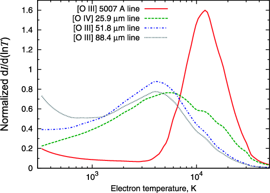 Table 1: Far-infrared line flux ratios to the dereddened 5007 Å line as derived from different theoretical models and observations. (See text for details).