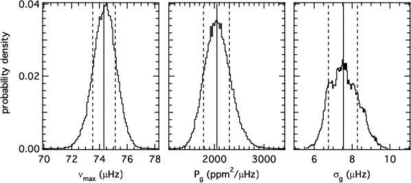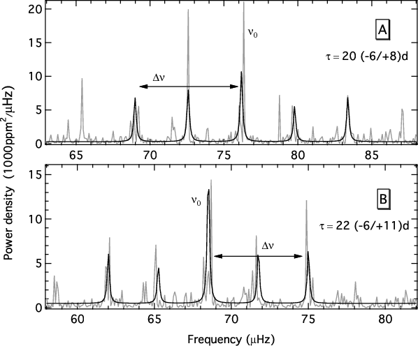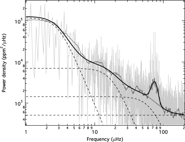 We note that we do not stop at this point. In a next step we will use the integral of the Gaussian part of our global power density model to deduce the total spectral power of solar-type pulsations, which we expect to scale with the luminosity-mass ratio. This, however, needs extensive calibration for solar-type pulsators with independently determined fundamental parameters, which we are currently carrying out. We believe that we can, for the first time, derive all basic fundamental parameters (mass, radius, luminosity, and consequently also the effective temperature) of a solar-type pulsator by simply measuring global properties of its oscillations in the power density spectrum. This will have influence on various astrophysical applications. One can use it as a distance indicator, or one can study the behavior of convective time scales of stars as a function of their position in the H-R diagram. By comparing the individual pulsation frequencies with theoretical eigenfrequencies it should be possible to investigate the parameterization of convective models (e.g., the mixing-length parameter) in a region of the H-R diagram where stars are very sensitive to these parameters.