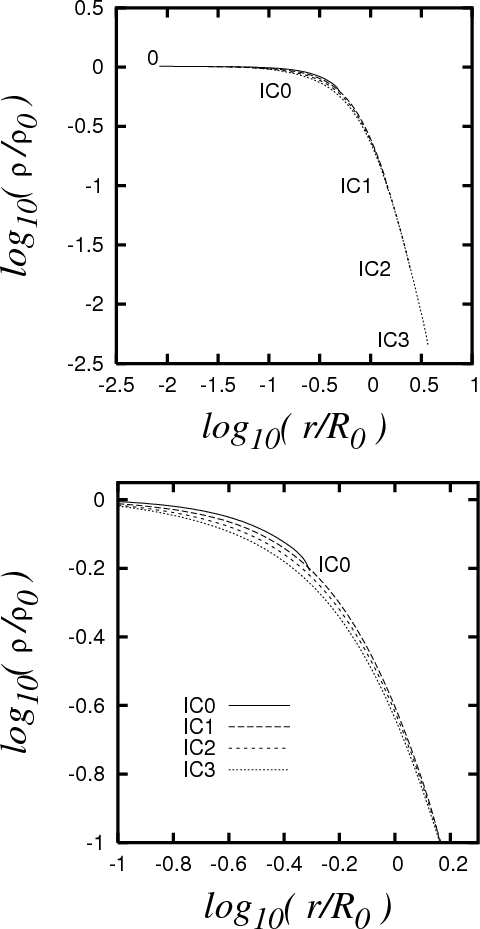 Our main physical motivation for studying these models is to explain the behavior of the well observed L1544 dense core. Tafalla et al. (1998) have presented a multiline and continuum study of L1544, and according to them this core presents evidence to be in an advanced state of evolution toward the formation of one or two low mass stars. A visual inspection of our results presented in Sect. 3 have convinced us that it is our models A3 and B3 which could be compared with L1544.