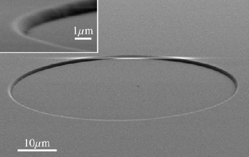 Figure 2: Scanning electron microscope image of the Roddier & Roddier phase mask, showing real proportions of the full mask (main image) and a zoom on the edge (inset). The edge is remarkably well defined and the depth uniformity is virtually perfect. The images were obtained using an environmental scanning electron microscope, Extended Pressure-SEM (Zeiss Evo 60). To avoid the deposition of a metallic coating onto the component, which would have excluded its future use, we used the low-air pressure, or ``environmental'', settings. The horizontal streak seen at the top of the mask is an artefact of the electron microscopy due to the accumulation of charges along the sharp edges of the mask, caused by the absence of a conductive coating. |