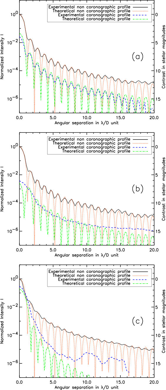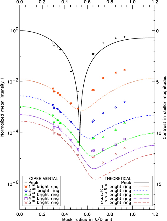 While the results of this experiment, described in detail in Guyon et al. (1999), clearly validated the principles of this new coronagraphic concept, it achieved only a modest peak intensity attenuation of 16. Theoretically, carefully adjusting the size of the mask to the size of the diffraction pattern (or vice-versa, by the aid of a variable iris entrance pupil), a peak intensity attenuation of infinity could have been achieved.