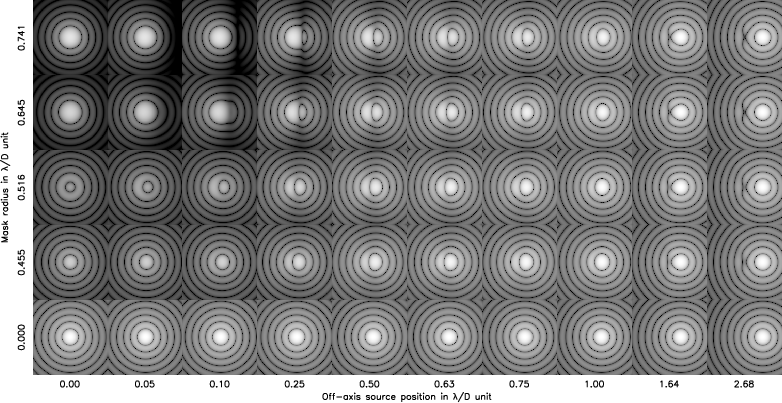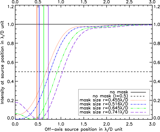Figure 10: Normalized coronagraphic image intensity at the source position as a function of the off-axis source position in the field and for different RRPM radii. The mask radius is indicated by the vertical lines. |