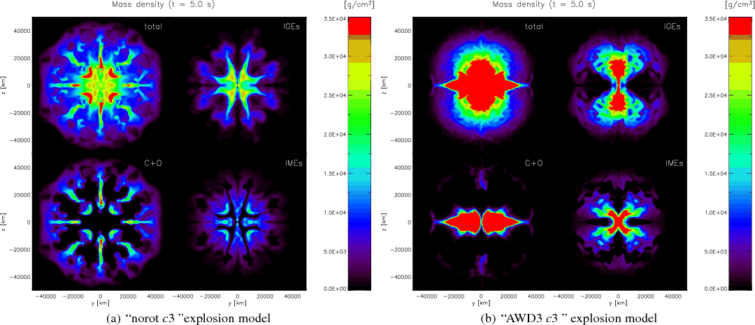 The first multidimensional simulations of rapidly rotating exploding WDs were carried out by Steinmetz et al. (1992). However, in contrast to our work they concentrated on pure detonations instead of deflagrations. We will revisit the prompt detonation scenario in a follow-up paper.