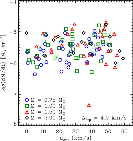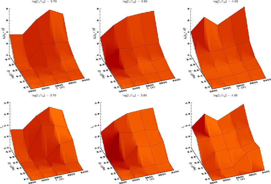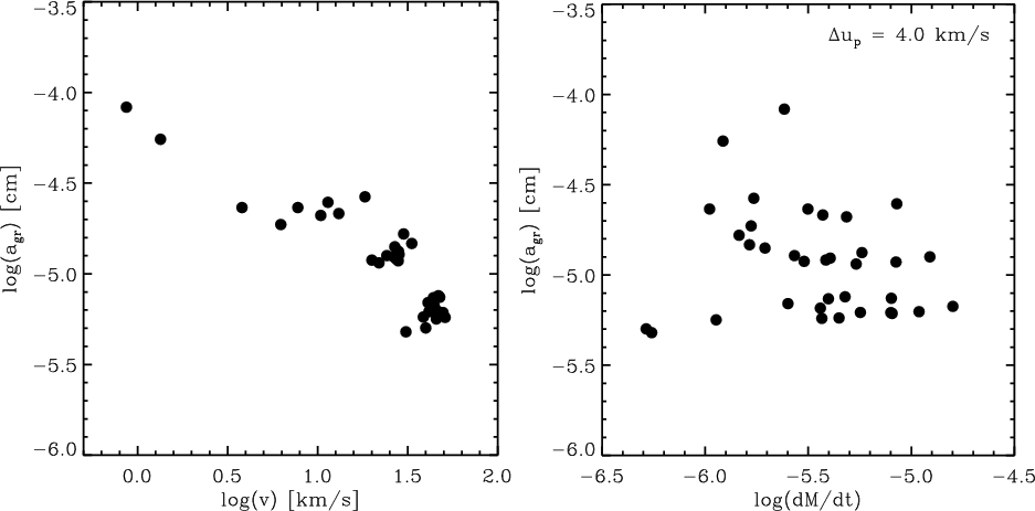 Höfner et al. (2003) presented dynamic model atmospheres which couple time-dependent dynamics and frequency-dependent radiative transfer, including a non-grey description of the dust component. Comparing the observable properties calculated from these state-of-the-art dynamical models (spectra and their variations over time) with mboxobservations has shown drastic improvements compared to the synthetic spectra based on previous (grey) generations of models (see, e.g., Gautschy-Loidl et al. 2004; Nowotny et al. 2005b,a). While further improvement may become possible in the future, a reasonable level of realism has now been reached in the modelling to allow application to stellar evolution. The model used in the present study is identical to that used in Mattsson et al. (2007a) and contains only minor modifications of the Höfner et al. (2003) model. It is probably the most advanced theoretical tool available at present for studying how dust driven winds of carbon stars depend on stellar parameters.