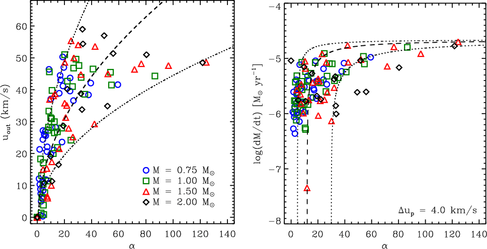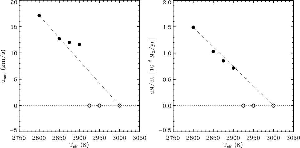 The fundamental idea behind a so-called dust driven wind is that stellar photons, incident on dust grains, will lead to a transfer of momentum from the radiation to the atmospheric gas, which is dragged along by the dust grains. Models of this process have existed for quite some time and have become increasingly more complex. Wood (1979) and Bowen (1988) made dynamic atmosphere models introducing a parameterised opacity to describe the effects of dust formation in the circumstellar envelope. Bowen & Willson (1991) further elaborated on the implications of their models for the mass loss during AGB evolution, i.e., the development of a so-called ``superwind'' phase. Blöcker (1995) then derived a modified version of Reimers' law based on the models of Bowen (1988) to prescribe mass loss in his calculations of stellar evolution on the AGB. This mass-loss prescription is still widely used, although it is entirely based on the early work by Bowen (1988).