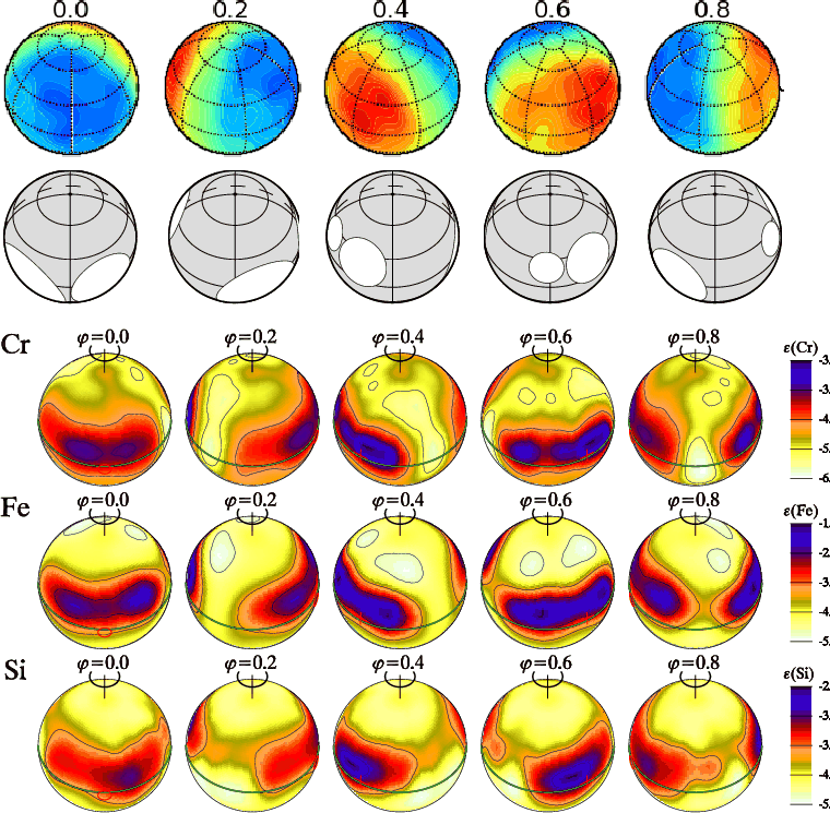 The elemental abundance spots of the species contributing dominantly to the changes in the integrated flux (Cr, Fe, and Si) are also clearly correlated with the magnetic field geometry and hence with photometric spots. Regions of overabundance are found close to the magnetic poles and those of depletion linked to the magnetic equator. As described in Sect. 7, these elements produce bright spots in the photosphere.
