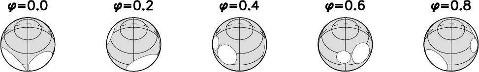 Figure 4: Locations of the four bright photometric spots, assumed to be of circular shape, plotted at five equidistant phases. |