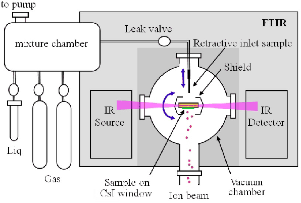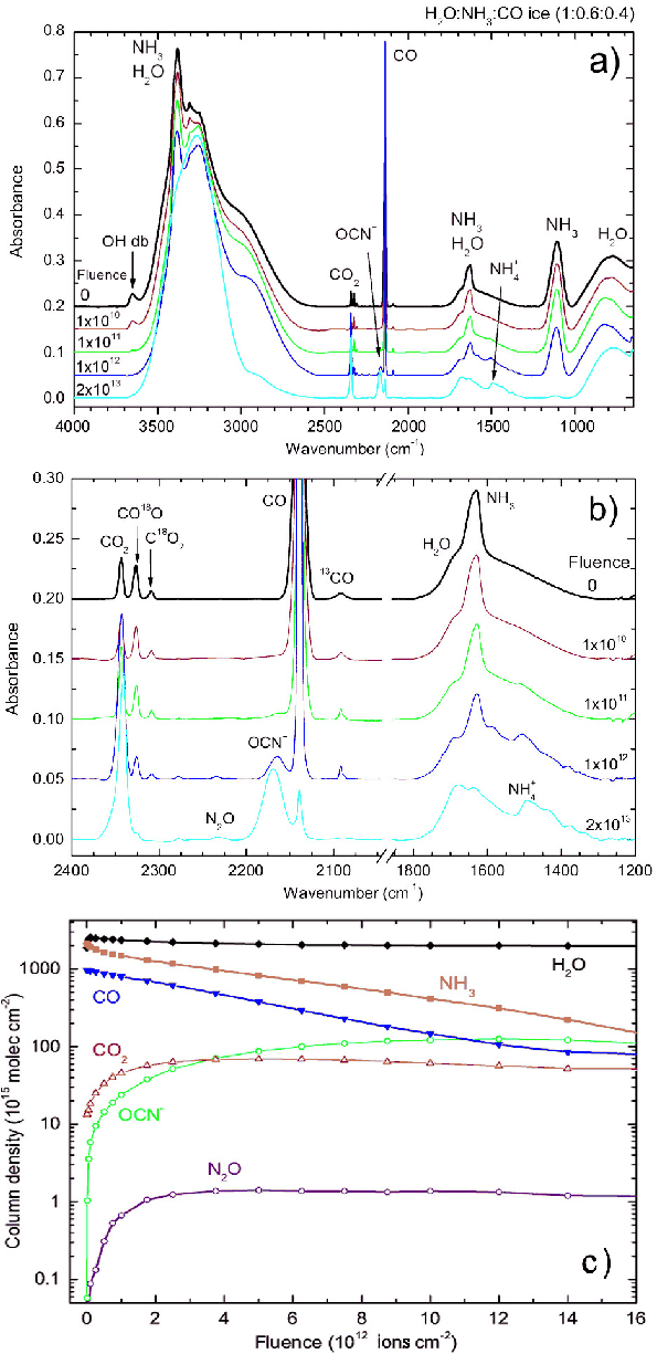 In-situ Fourier-transformed infrared (FTIR) spectra were recorded for ices irradiated at different fluences, up to