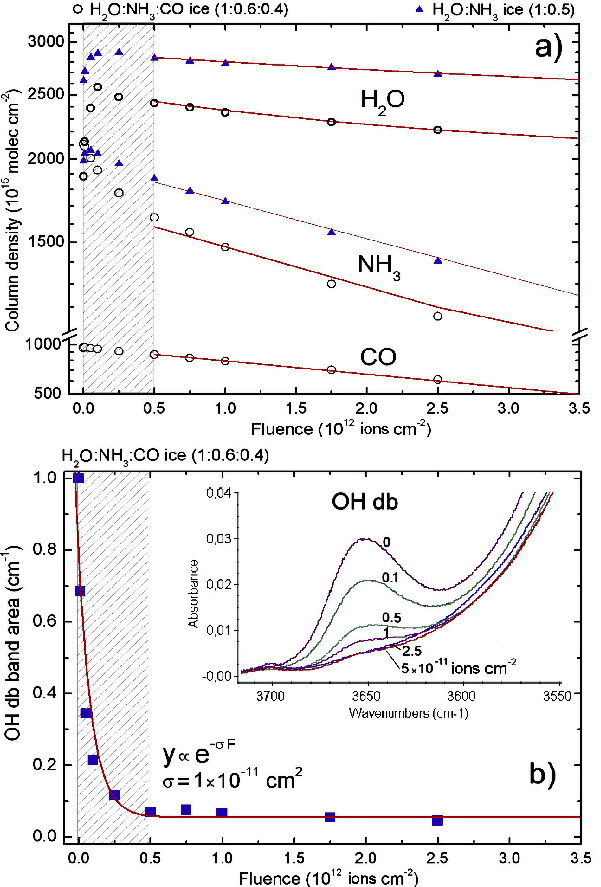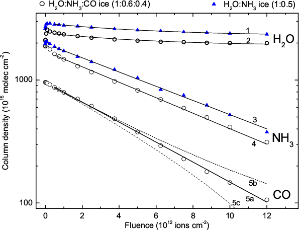 The analyzed ice layers were thin enough: i) to avoid saturation of the FTIR signal in transmission mode; and ii) to be fully crossed by an ion beam of approximately the same velocity. This latter point is important since a relatively low total kinetic energy loss of the projectile in the film guarantees that the studied cross-sections remain constant.