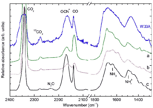 One of the most reactive and important molecules observed from photolysis and radiolysis experiments of ammonia-containing ices, in which there is a carbon source, is the cyanate ion, OCN- (e.g., Demyk et al. 1998; Hudson & Moore 2000; van Broekhuizen et al. 2005, and references therein). Its infrared band around 2165 cm-1 was observed in several protostellar sources (e.g., Lacy et al. 1984; Gibb et al. 2000; Whittet et al. 2001) indicating regions where UV photochemistry and ion/electron bombardments have played an important role in the chemical alteration of grain mantles.