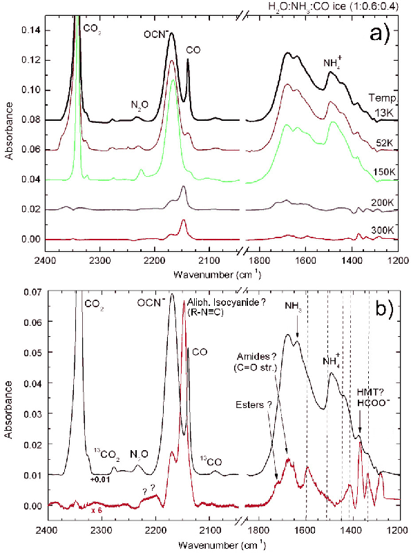 HNCO, N2O, OCN-, and NH4+. In the case of the irradiated H2O:NH3:CO