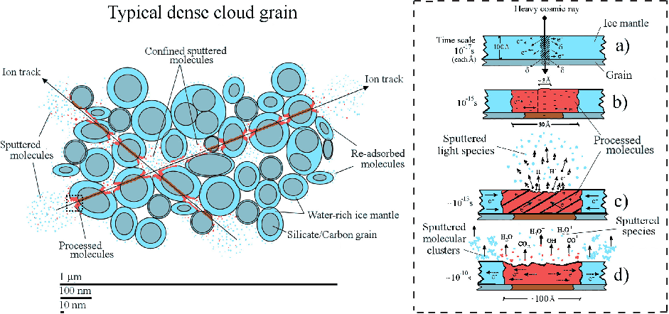 The observation of molecules in the gas phase deeply inside these cold and dense regions, where the gas sticking efficiency on grains is close to unity, suggests that they are indeed energetically active regions (e.g., Ehrenfreund & Charnley 2000). Only a negligible amount of stellar UV photons reaches the inner parts of dense regions (Tielens & Hagen 1982; d'Hendecourt et al. 1985). Other mechanisms have therefore been proposed to explain the presence of free molecules such as cosmic-ray-induced UV photons (Prasad & Tarafdar 1983) and direct cosmic ray interaction with ice mantles (e.g. Shen et al. 2004). Both processes lead to molecular desorption from the surface. As pointed out by Shen et al. (2004), in the case of cosmic ray particles, the sputtering produced by direct impact and whole grain heating (classical sublimation) due to energy deposition in the bulk are also two efficient processes for releasing molecules from frozen surfaces to the gas phase.
