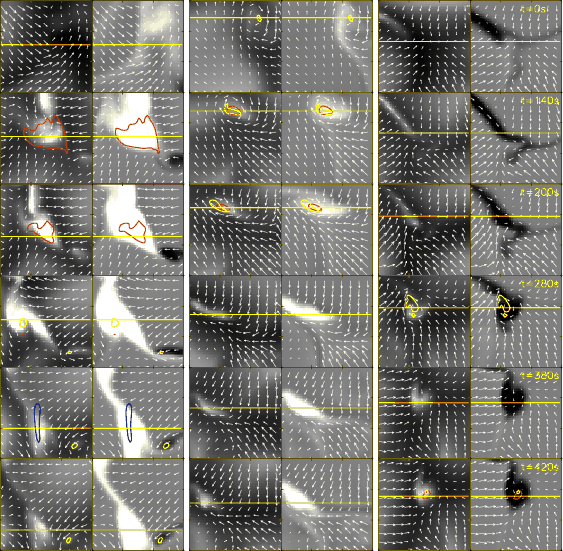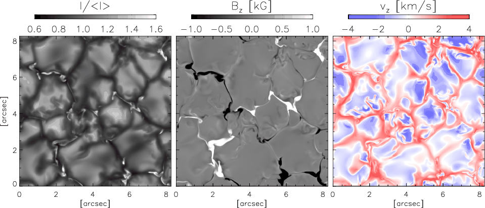 Normalized continuum intensity at 630 nm ( left), the vertical component of the magnetic field ( middle) and velocity ( right) at a geometrical height roughly corresponding