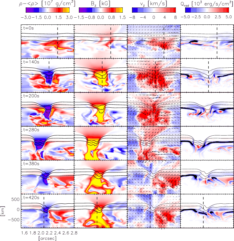 The downflow velocities reach maximum values of 5-10 km s-1 at