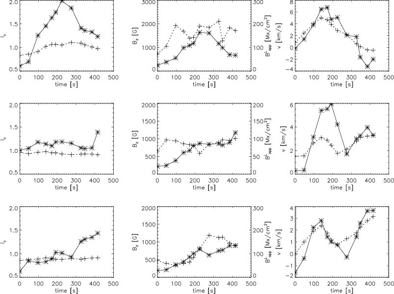 Evolution of the continuum intensity at 630 nm and the magnetic field in a