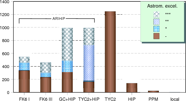 Figure 1: Number of stars in EOC-0 taken over from original catalogs, and their ``astrometric excellency''. |