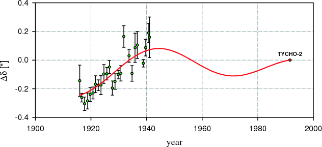 | Figure 3: Declination of the star No. 518 whose period, taken from the Sixth Catalog, is 106.70y. Position in TYCHO-2 is also shown. |