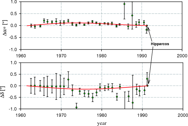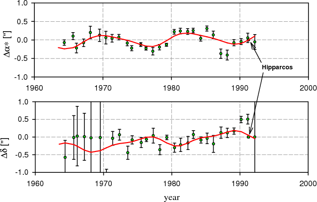 It is clear that including the periodic terms into the solution helps to improve the fit with the observations, and also that the position calculated for the mean epoch of the Hipparcos mission agrees well with the position measured by the satellite.