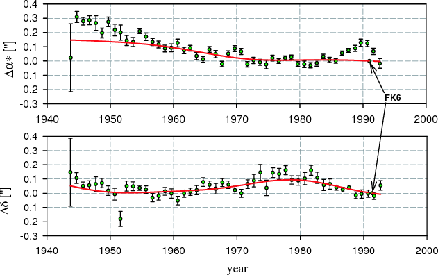 Generally speaking, declinations are better determined than right ascensions for all parameters computed in this study (i.e., positions, proper motions, and amplitudes of periodic terms). The difference is most obvious in proper motions (compare left and right parts of Fig. 12). This is evidently caused by a longer history of observing declinations (since 1899) in contrast to right ascensions (since 1956).