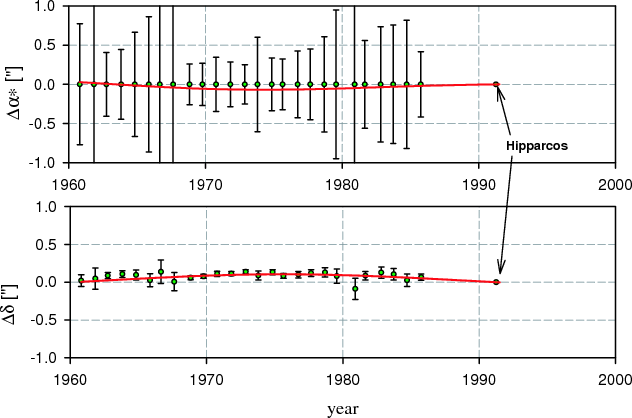 Figure 7: Right ascension and declination of the component A of double star No. 9640 whose period, found in the Sixth Catalog and confirmed by spectral analysis, is 63.67 y. Position in Hipparcos is also shown. |
