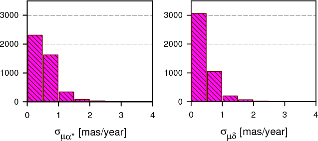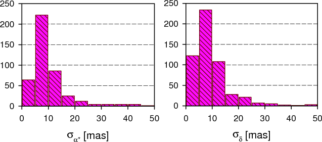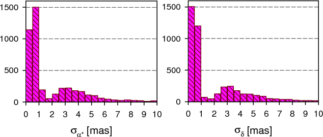 The distributions of formal standard errors of the catalog in position and proper motion are shown in Figs. 11 and 12, respectively. They are very similar to our preceding catalogs EOC-2 and EOC-3. The median value of sigmas in right ascension is 0.75 mas, in declination 0.61 mas. Again, we see two distinct maxima (a bigger one between 0 and 1 mas and a smaller one around 3 mas) in sigmas in position (Fig. 11), reflecting the two different statistical populations with different accuracy - ARIHIP and TYCHO-2.
