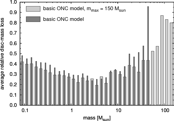 It has been shown only recently by numerical simulations that stellar encounters do have an effect on the discs surrounding stars in a young dense cluster Moeckel & Bally 2006; Pfalzner & Olczak 2007b; Olczak et al. 2006; Pfalzner 2006; Pfalzner & Olczak 2007a; Moeckel & Bally 2007b; Pfalzner et al. 2006; Moeckel & Bally 2007a; see also the review by Zinnecker & Yorke 2007. The massive stars in the centre of such a stellar cluster act as gravitational foci for the lower mass stars (Pfalzner et al. 2006). Discs are most affected when the masses of the stars involved in an encounter are unequal (Olczak et al. 2006; Moeckel & Bally 2007b), so it is the massive stars which dominate the encounter-induced disc-mass loss in the young dense clusters (Olczak et al. 2006). Observational evidence for this effect has been found by Olczak et al. (2008).