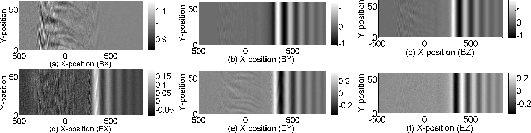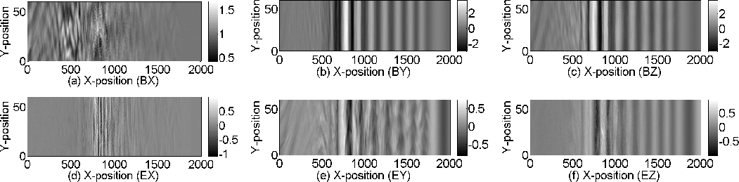 Figure 2: Electromagnetic field amplitudes in the simulation at the time T1. The upper row shows the magnetic field components Bx (x,y) a), By (x,y) b) and Bz (x,y) c). The lower row displays the Ex (x,y) d), Ey (x,y) e) and Ez (x,y) f). |