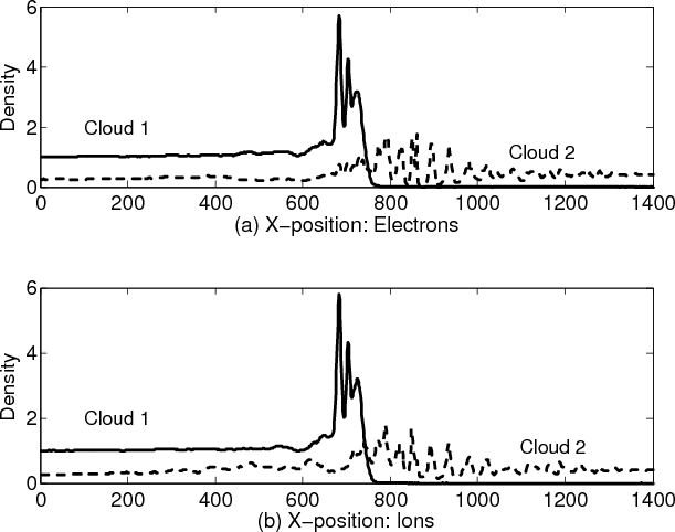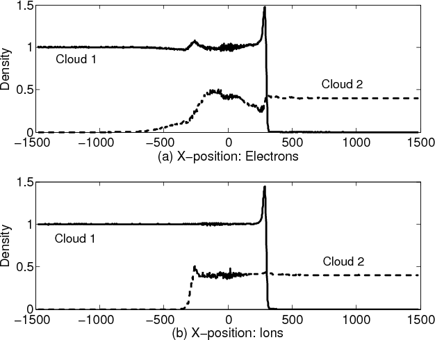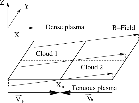We model the collision of two plasma clouds. Each cloud consists of co-moving and equally dense electron and ion species. This system is sketched in Fig. 1.