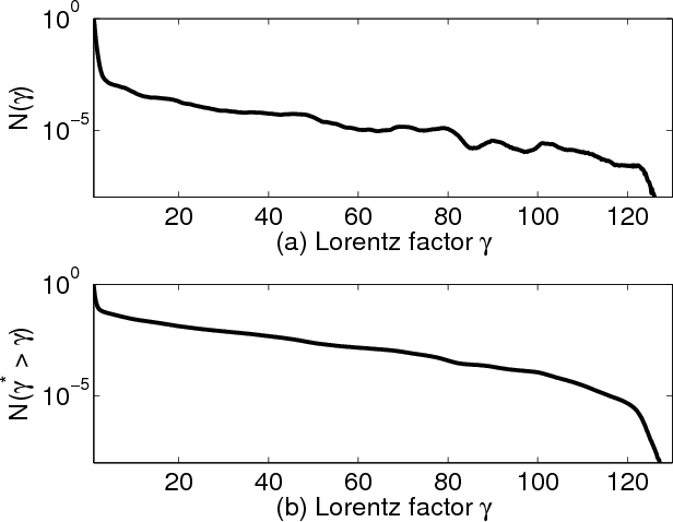 We perform here a case study with initial conditions, which are similar to those employed by Dieckmann et al. (2008b). We reduce the collision speed to 0.5c and lower the temperature. The plasma cloud representing the subshell is ten times denser than the plasma cloud that represents the ambient plasma (interstellar medium), into which the shell expands. A guiding magnetic field is quasi-parallel to the plasma flow velocity vector and it results in an electron gyrofrequency that equals the electron plasma frequency of the dense cloud. These bulk plasma parameters have been selected with the intention to enforce a planar shock front (Dieckmann et al. 2008b; Bret et al. 2006; Hededal & Nishikawa 2005), by which we can model the shock in one- or two-dimensions in space. The reduced ion-to-electron mass ratio we use allows us to model this collision in form of a 2(1/2)D particle-in-cell (PIC) simulation, which resolves two spatial and three momentum dimensions.