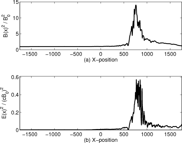 Alfvén waves and other magnetohydrodynamic (MHD) waves can grow to amplitudes, at which they start to interact nonlinearly with the plasma (Stasiewicz & Ekeberg 2008). Short Large Amplitude Magnetic Field Structures (SLAMS) are nonlinear MHD waves occuring at quasi-parallel shocks and may be relevant for our simulation. The SLAMS can be efficient electron accelerators (Mann & Classen 1997). Their magnetic amplitude reaches several times that of the background field and they can propagate with a super-Alfvénic speed, because they convect with the ions (Mann et al. 1994; Behlke et al. 2003). SLAMS have also been observed in simulations (Scholer et al. 2003). The acceleration of electrons by sub-structures of quasi-parallel shocks, which may be SLAMS, has been observed in the solar corona (Mann et al. 1998).