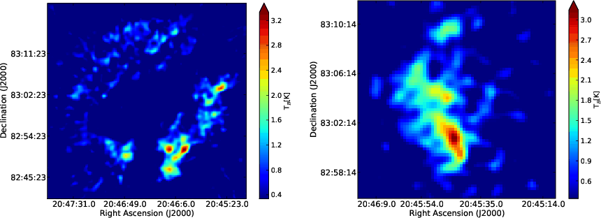 stray radiation. Channel maps show numerous clumps and filaments that are