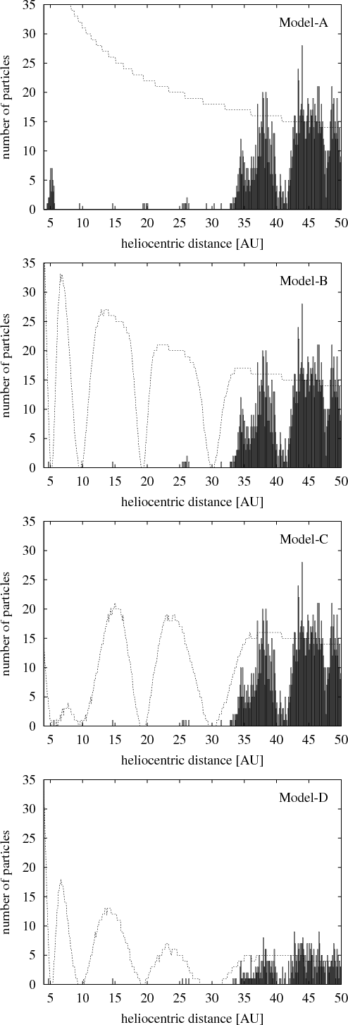As mentioned in Sect. 1, the structure of the PPD was obviously not smooth when the era of a massive OC formation began. A lot of its material was already spent for the formation of planets. Thus, the formation might lead to the occurrence of gaps around the orbits of planets. The gaps formation during the era of the gaseous solar nebula has been described in several papers (Papaloizou et al. 2004; Bryden et al. 1999; Lin & Papaloizou 1993; Papaloizou et al. 1999). Unfortunately, a detailed heliocentric-distance distribution of the planetesimals in the PPD after the gas was gone is not known. We simply assume a random depletion of the given planetary zone and, consequently, the Gaussian profile of each gap.