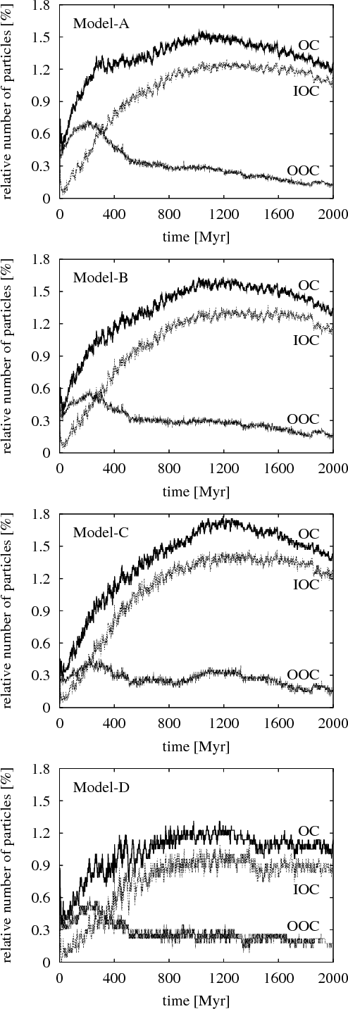 The absence of TPs in the gaps is obviously also a reason of a higher efficiency of IOC formation for the B- and C-models in comparison with the A-model. As found in the past (Safronov 1972), the comets surviving in the OC till today were delivered there mainly by Uranus and Neptune. The rate of the delivery by these two planets increases as the OC-comet semi-major axis decreases. Therefore, a larger amount of TPs should appear in the IOC in the case of the PPD models with a relatively larger amount of particles in the Uranus-Neptune region, i.e. in the B- and especially the C-model. For the A-model with the relatively lower amount of TPs in the Uranus-Neptune regions, some TPs are moreover ejected into the interstellar space at the close planetary encounters. The D-model, corresponding with r-2 initial surface-density profile, is centrally most concentrated and, therefore, the population of the IOC is the lowest in this case. The same conclusion is qualitatively valid for the entire OC, since only a relatively small number of TPs resides in its outer part.