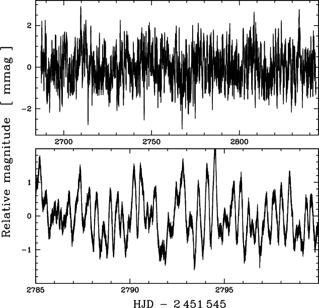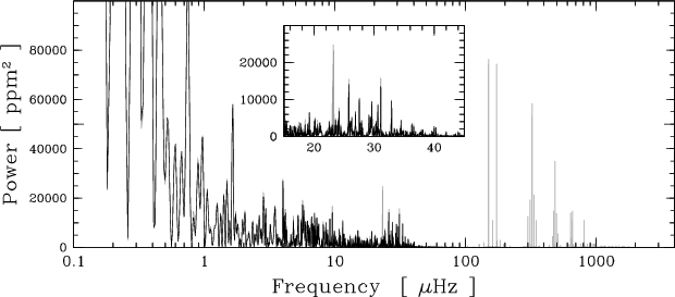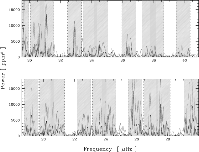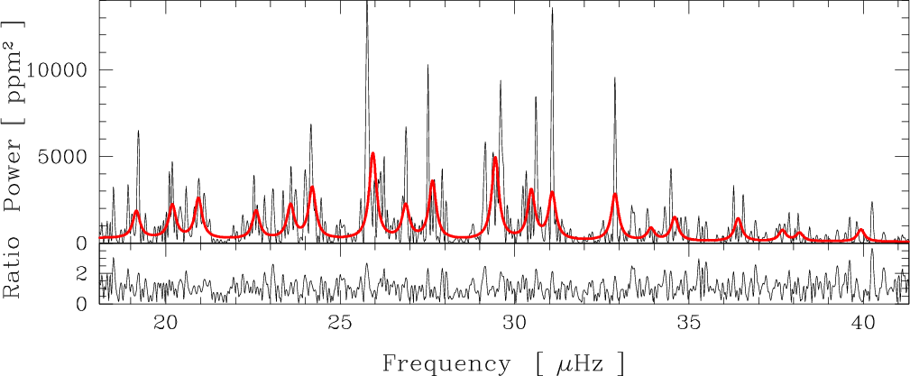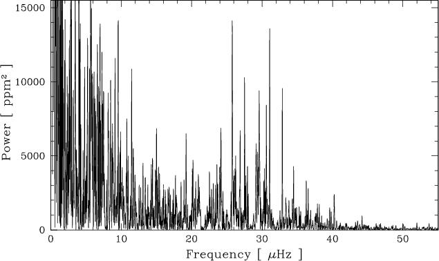 Results. The power spectrum of the high-precision time series clearly exhibits several identifiable peaks between 19 and 40