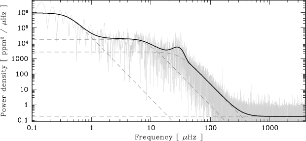 Figure 3: Power density spectrum of the photometric time series of HR 7349 and a multi-component function (black line) fitted to the heavily smoothed power density spectrum. The function is the superposition of three power-law components (dashed lines), white noise (horizontal dashed line) and a power excess hump approximated by a Gaussian function. |