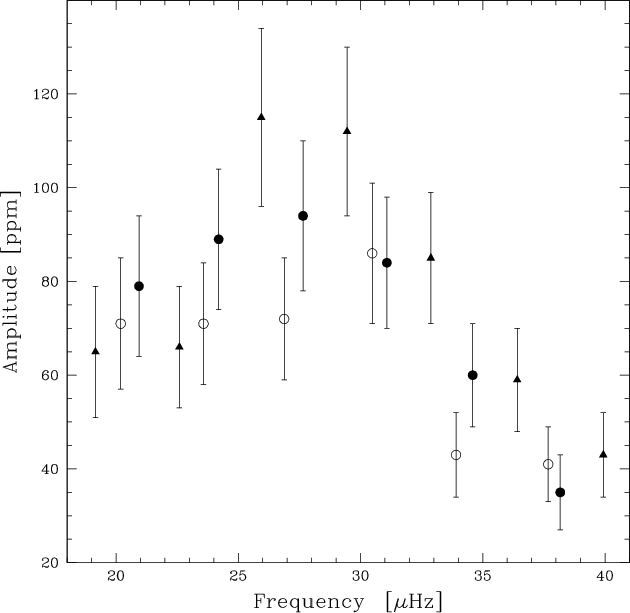 Figure 10: Amplitude of the oscillation modes versus frequency. The symbols used are the same as for Fig. 8. |