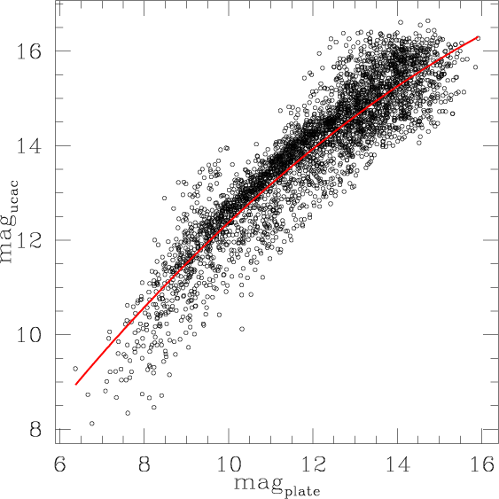 In the final catalogue we have rejected stars that come from just one measure, because, at minimum, every real stellar image should have at least two measures owing to the fact that we have digitized every plate twice. The two scans of the same plate were considered as separate measures, as a justifiable simplification. Even if those two scans are not truly independent, they are still significantly enough independent because of the dominant contribution of the measuring process to the total error. So, we think that treating them as independent measures for the purposes of computing averages and uncertainties might be roughly correct. As far as the uncertainty estimates goes, the validity of this approximation is shown to be reasonable by the external checks on the error estimates, i.e., the open clusters and the comparison with the Hipparcos data. We have also removed uncertain or failed matches with stars in the UCAC2, which were needed to calculate proper motions. For this reason, the UCAC2 completeness sets our completeness. In addition to this we have further losses due to the detection pipeline in combination with the problematical plates.