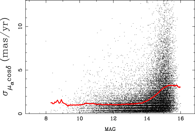 12 for well-measured stars) and the proper-motion uncertainty is 2.0 mas/yr (1.2 mas/yr for well-measured stars).