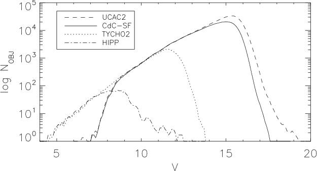 Figure 14: Completeness of the CdC-SF catalogue: magnitude distribution compared to other astrometric catalogues. |