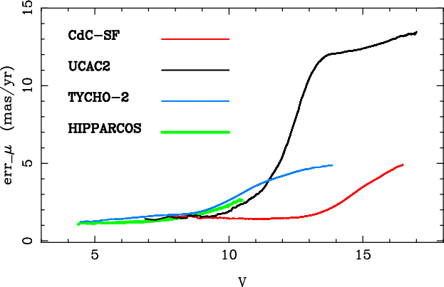 Figure 15: Moving-average error of CdC-SF proper motions, as a function of magnitude, compared with Hipparcos, Tycho-2 and UCAC2. |