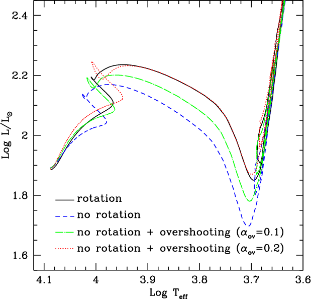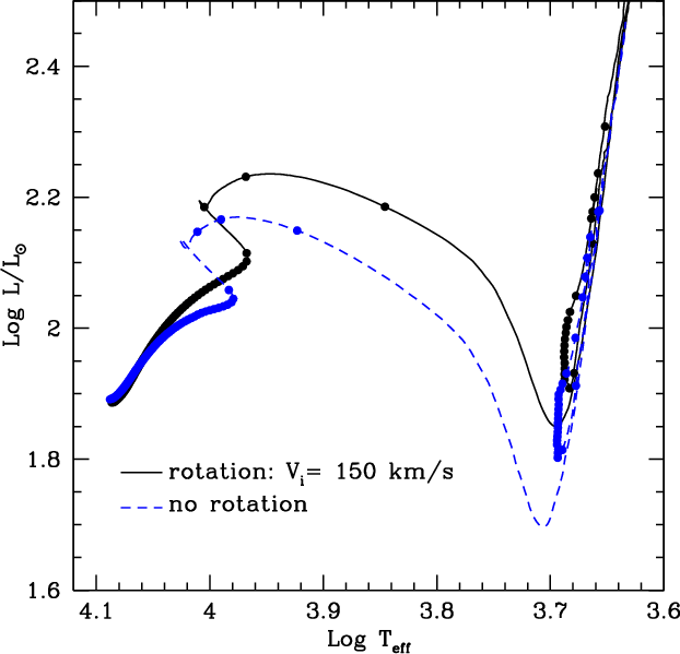 The stellar evolution code used for these computations is the Geneva code that includes a comprehensive treatment of shellular rotation as briefly described in the preceding section (see Eggenberger et al. 2008, for more details).3.1 Effects of rotation in the HR diagram