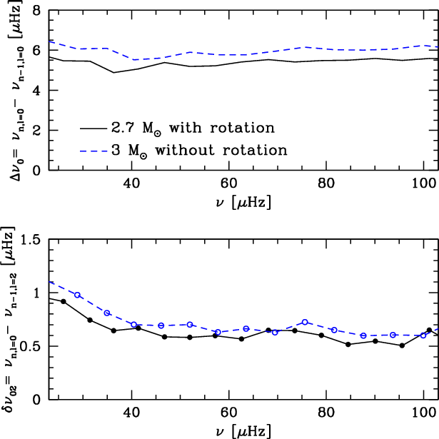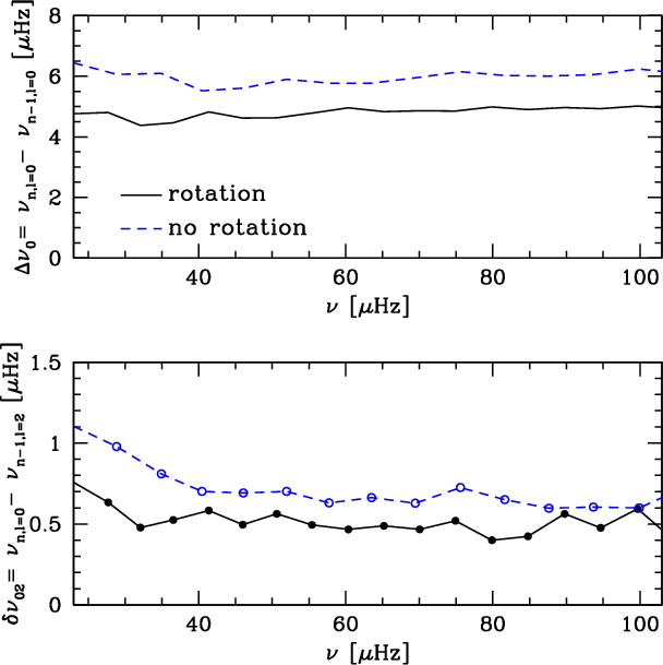 The asteroseismic features of both models are compared in Fig. 8. The rotating