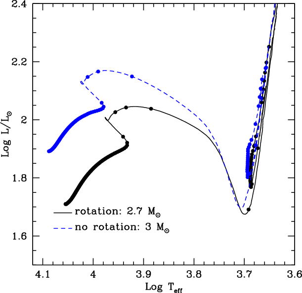 in the effective temperature of the rotating model. Both models share indeed the same luminosity, while the slightly